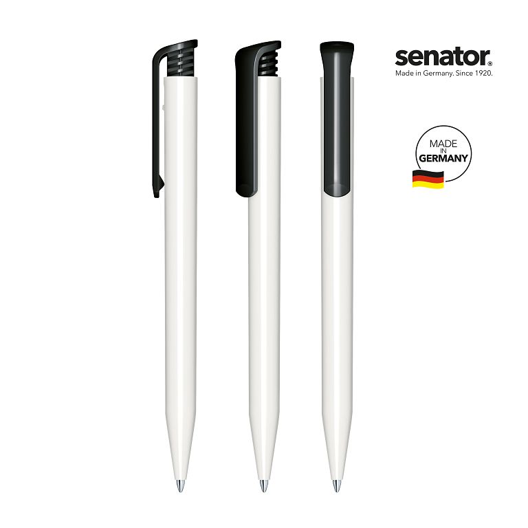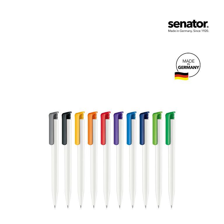 Push ball pen senator® Super Hit Polished Basic – classic and popular. The Super Hit Polished Basic combines a glossy opaque surface with a white barrel and coloured clip. Its minimalist design makes it a versatile classic. It also relies on the special mechanism consisting of just two plastic parts. With the senator® X20 refill, it can write up to 2,000 metres – precisely and smoothly. The ball pen is made in Germany and stands for quality, popularity and proven function.